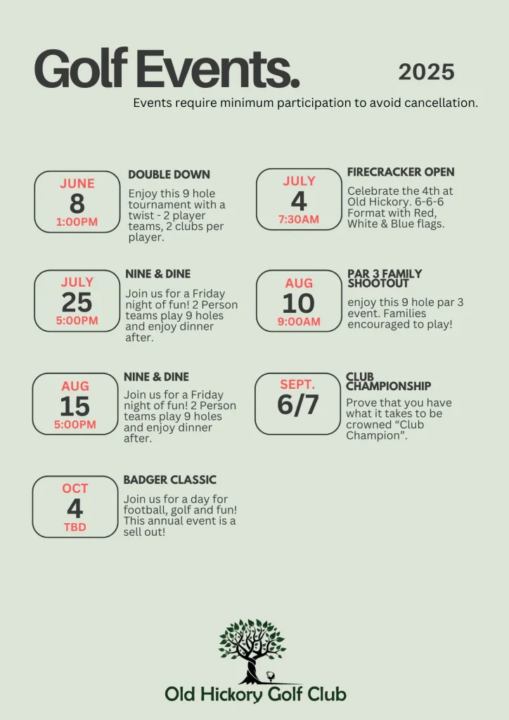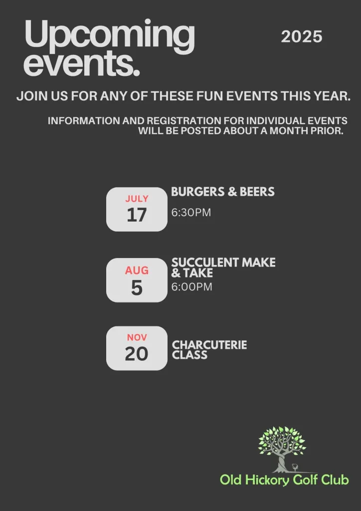 Club Events Book a Tee Time Old Hickory hosts several events annually. Various golf outings and dining events. Save the date for these great events!
