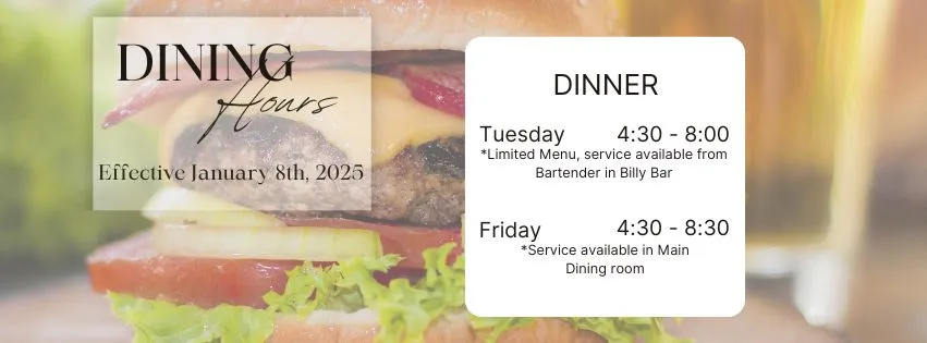Memorial Day to Labor Day – Lunch Menu Service and Thursday evening dining, available both in the bar and on the terrace.